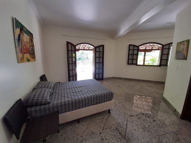 Os quartos do nosso sítio foram concebidos com um design claro. Assim como toda a casa, os quartos têm piso de granito de alta qualidade e dispõem de uma cama de casal e closet. Cada um dos grandes quartos do andar térreo dá acesso à varanda por uma porta dupla. Todas as seis suítes são equipadas com um banheiro espaçoso e ducha em box de vidro.